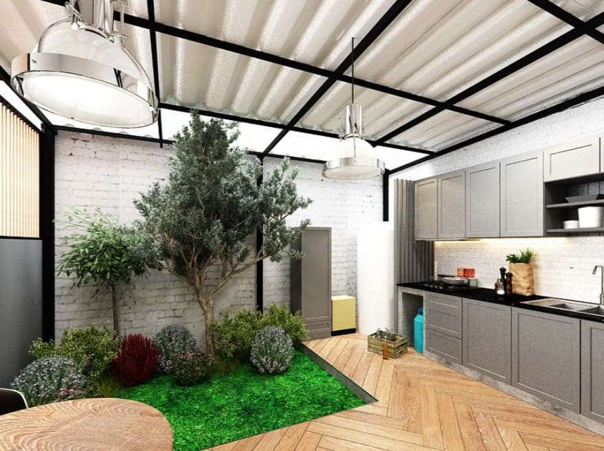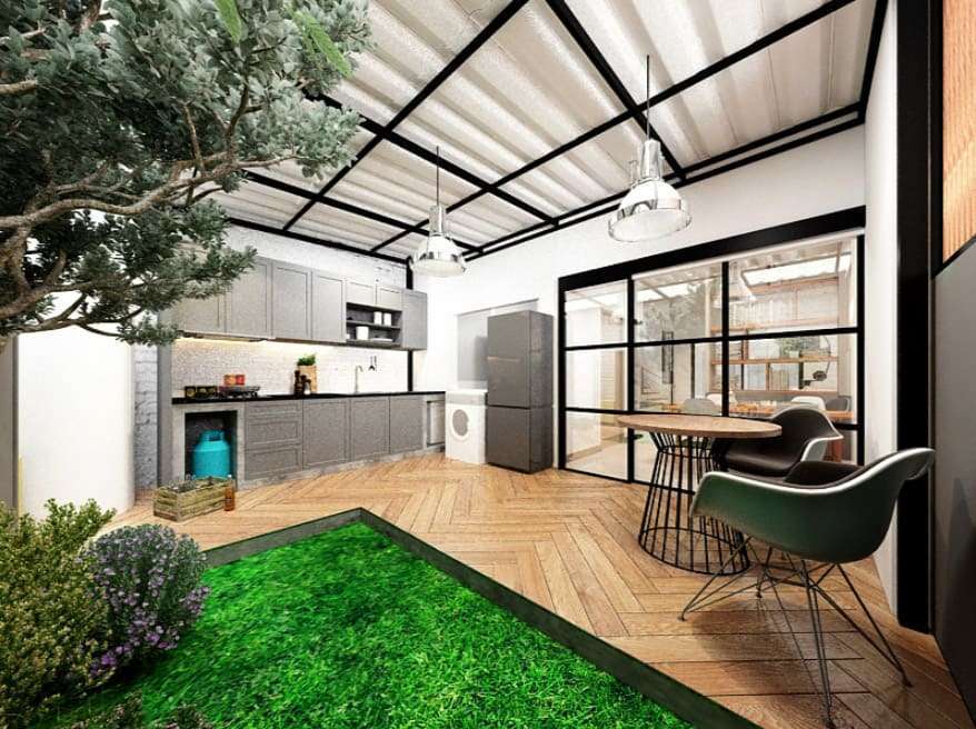 ดีไซน์ที่ผสมผสานของทั้งความร่วมสมัยและความทันสมัย โทนสีของสไตล์นี้จึงมีความเรียบง่าย คลาสสิค และเข้ากับวัสดุธรรมชาติอย่างไม้หรืออิฐเป็นอย่างดี บ้านถูกออกแบบต่อเติมด้านหลังใหม่ให้เป็นครัวไทยเหมาะแก่การใช้สอยของคนในยุคปัจจุบัน และถูกตกแต่งด้วยวัสดุเช่นกระเบื้องแทนหินเพื่อประหยัดงบการตกแต่งภายในที่อาจไม่จำเป็นเท่าโครงสร้างที่แข็งแรง